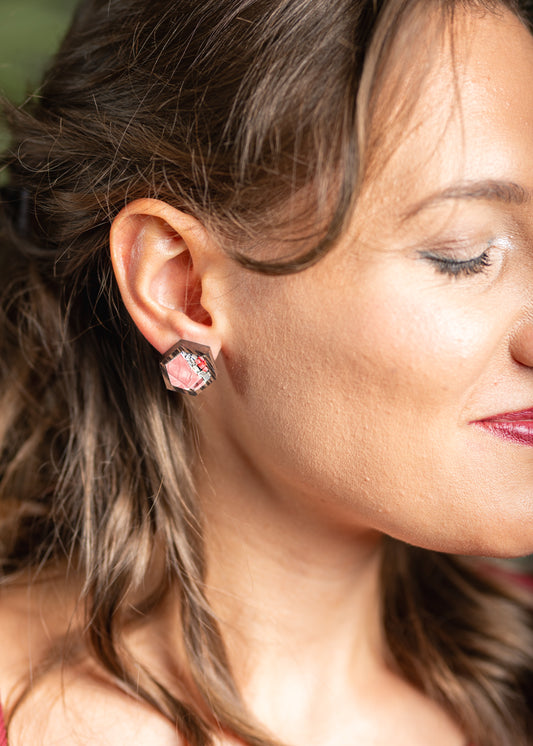 Orecchini esagonali rosa in legno e mosaico | Upsidu