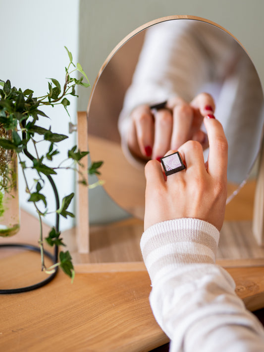 Anello lilla quadrato in legno e mosaico | Upsidu